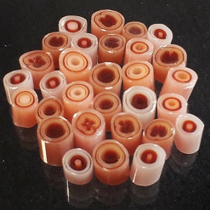 Slices are ≤ 1/8" thick and 1/8" - 6/32" in diameter. Each bag contains 1/4 oz of murrini, which is around 50 slices. You will receive a variety of slices, as pictured in the photos - however, every pull is slightly different so the slices you receive will not be the exact same slices pictured.