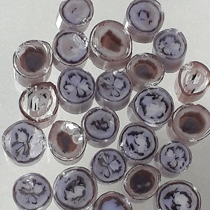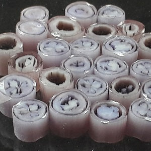 Slices are ≤ 1/8" thick and 1/8" - 6/32" in diameter. Each bag contains 1/4 oz of murrini, which is around 50 slices. You will receive a variety of slices, as pictured in the photos - however, every pull is slightly different so the slices you receive will not be the exact same slices pictured.