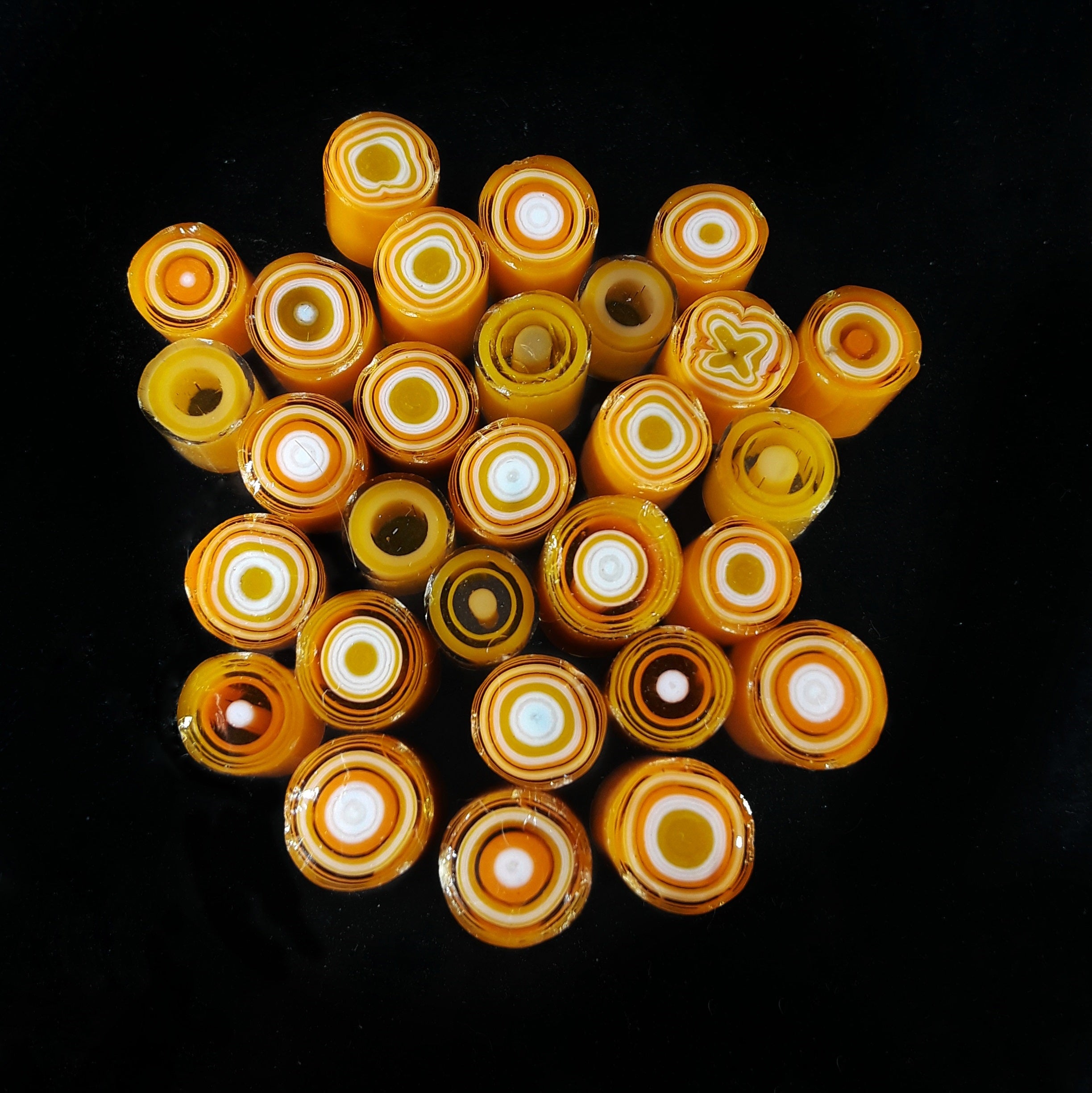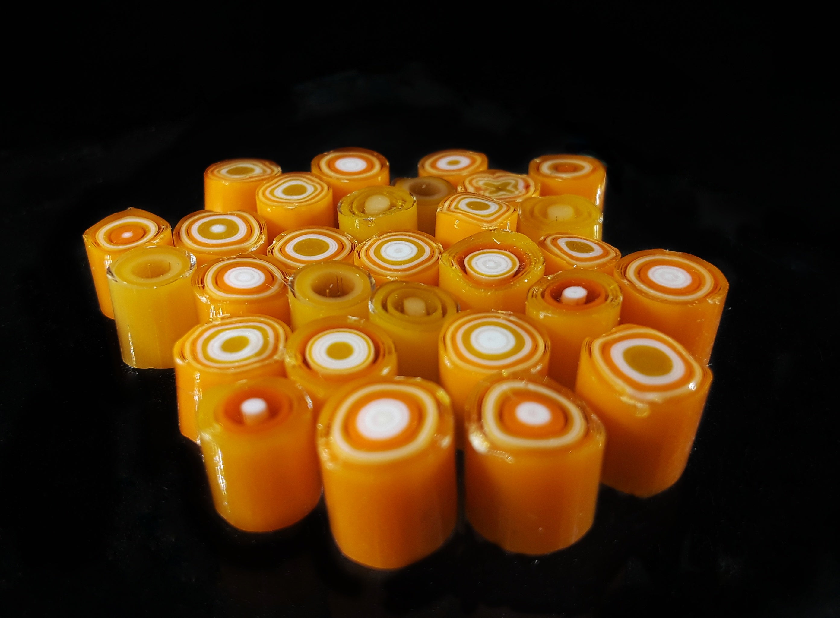 Murrini Man© murrini is pulled by hand by Ted Mumford, an artist working in the Pacific Northwest region of the United States. Each batch is made using only the highest quality equipment, and ONLY Bullseye Glass.