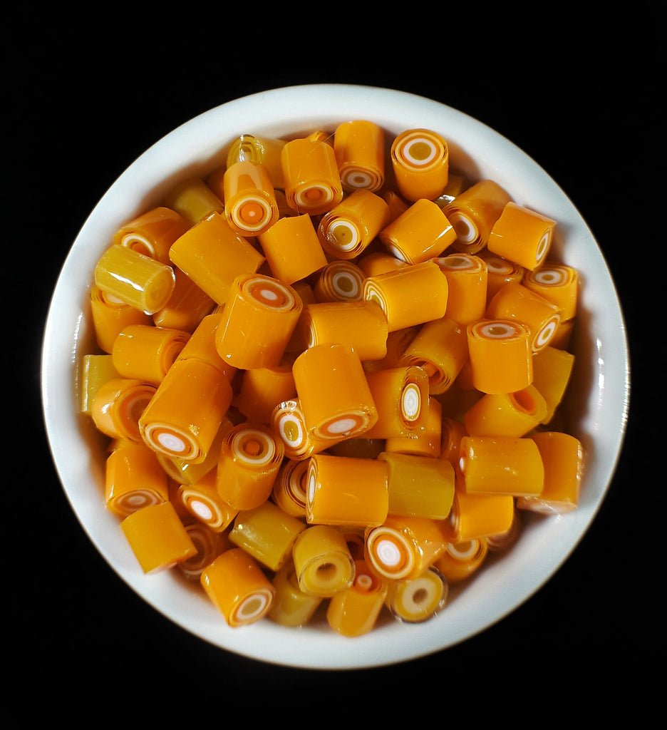 Slices are ≤ 1/8" thick and 1/8" - 6/32" in diameter. Each bag contains 1/4 oz of murrini, which is around 50 slices. You will receive a variety of slices, as pictured in the photos - however, every pull is slightly different so the slices you receive will not be the exact same slices pictured.