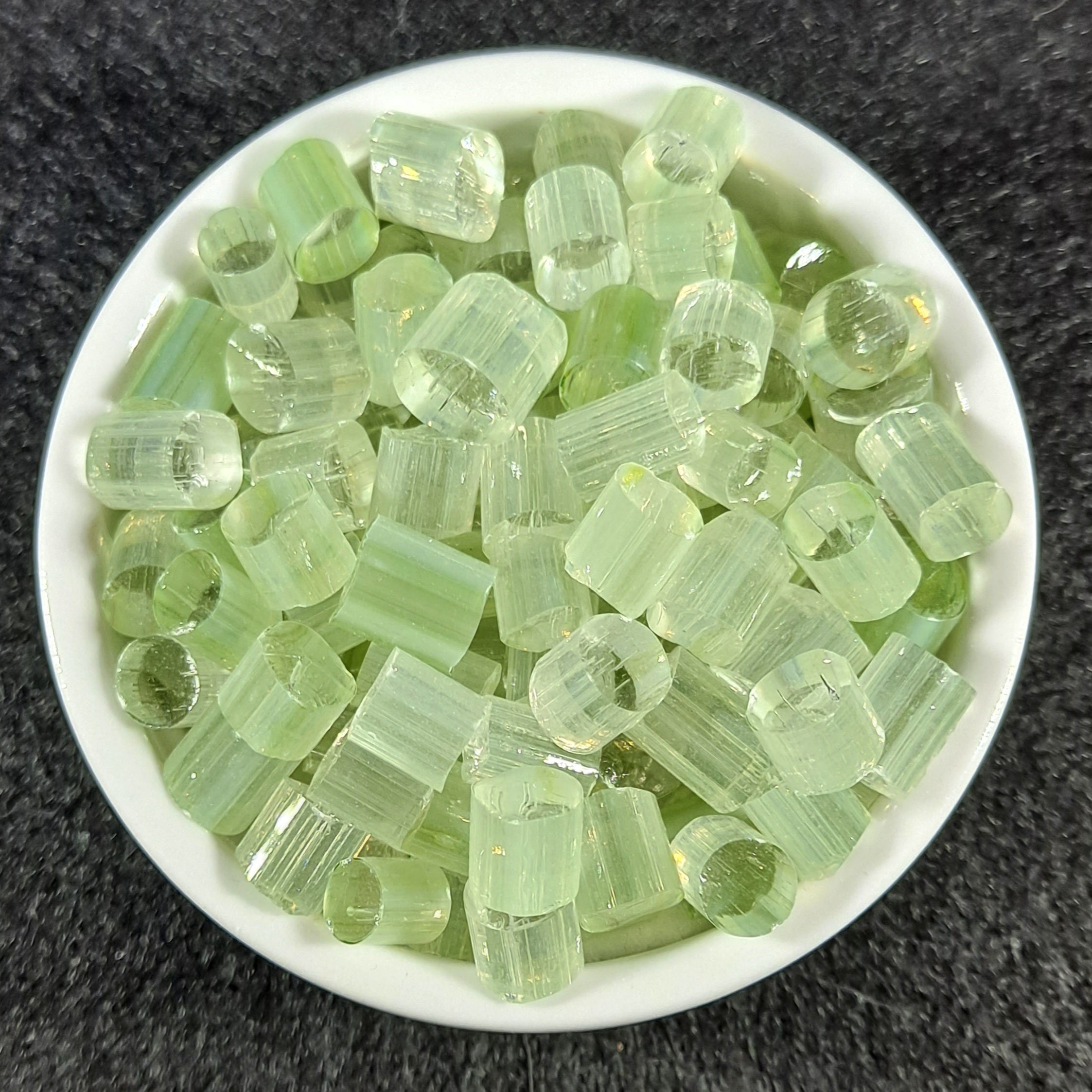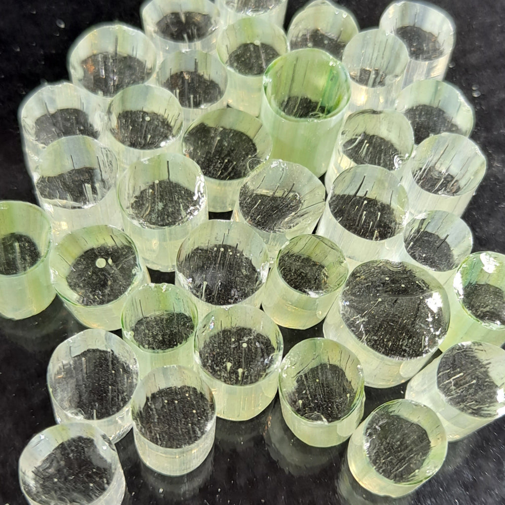 Slices are ≤ 1/8" thick and 1/8" - 6/32" in diameter. Each bag contains 1/4 oz of murrini, which is around 50 slices. You will receive a variety of slices, as pictured in the photos - however, every pull is slightly different so the slices you receive will not be the exact same slices pictured.