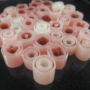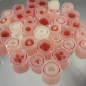 Slices are ≤ 1/8" thick and 1/8" - 6/32" in diameter. Each bag contains 1/4 oz of murrini, which is around 50 slices. You will receive a variety of slices, as pictured in the photos - however, every pull is slightly different so the slices you receive will not be the exact same slices pictured.