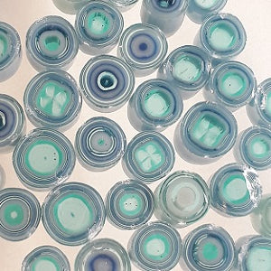 Slices are ≤ 1/8" thick and 1/8" - 6/32" in diameter. Each bag contains 1/4 oz of murrini, which is around 50 slices. You will receive a variety of slices, as pictured in the photos - however, every pull is slightly different so the slices you receive will not be the exact same slices pictured.