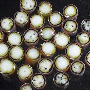 Slices are ≤ 1/8" thick and 1/8" - 6/32" in diameter. Each bag contains 1/4 oz of murrini, which is around 50 slices. You will receive a variety of slices, as pictured in the photos - however, every pull is slightly different so the slices you receive will not be the exact same slices pictured.