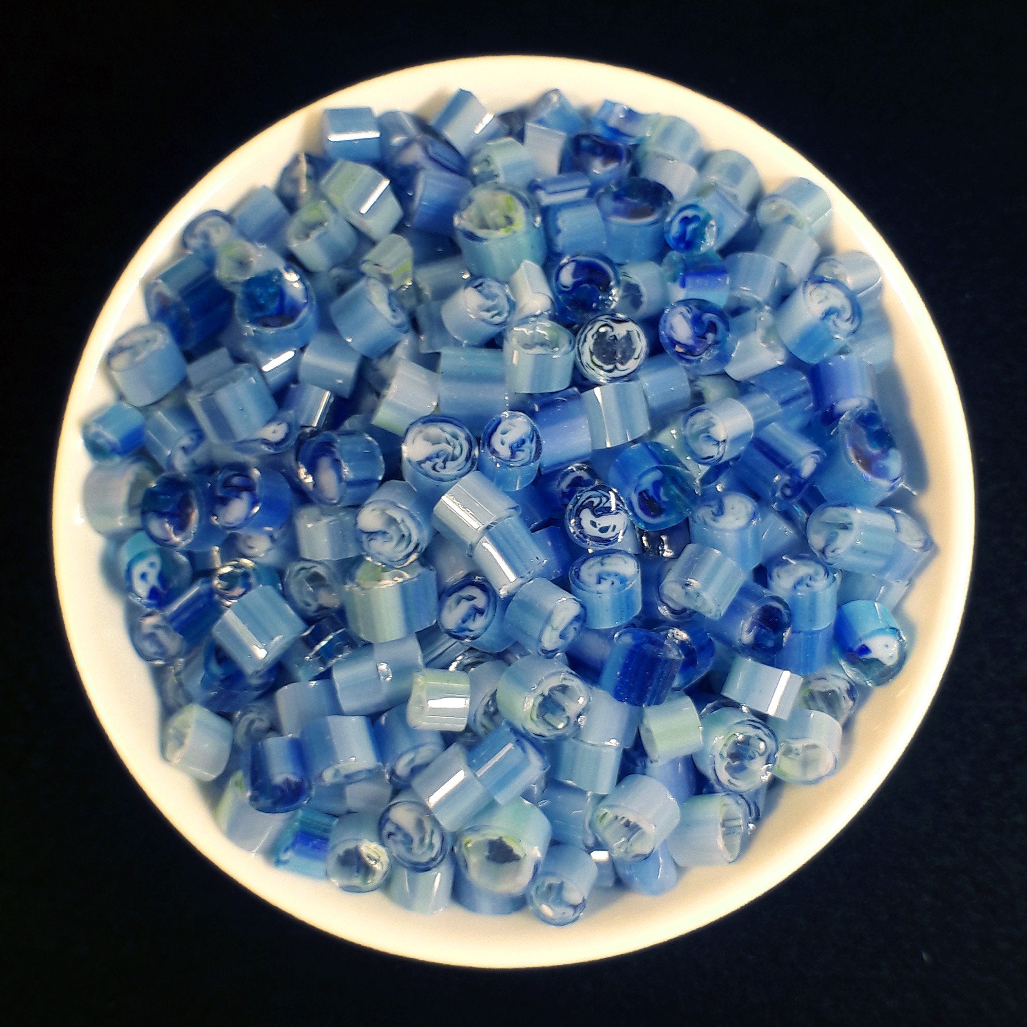 Slices are ≤ 1/8" thick and 1/8" - 6/32" in diameter. Each bag contains 1/4 oz of murrini, which is around 50 slices. You will receive a variety of slices, as pictured in the photos - however, every pull is slightly different so the slices you receive will not be the exact same slices pictured.