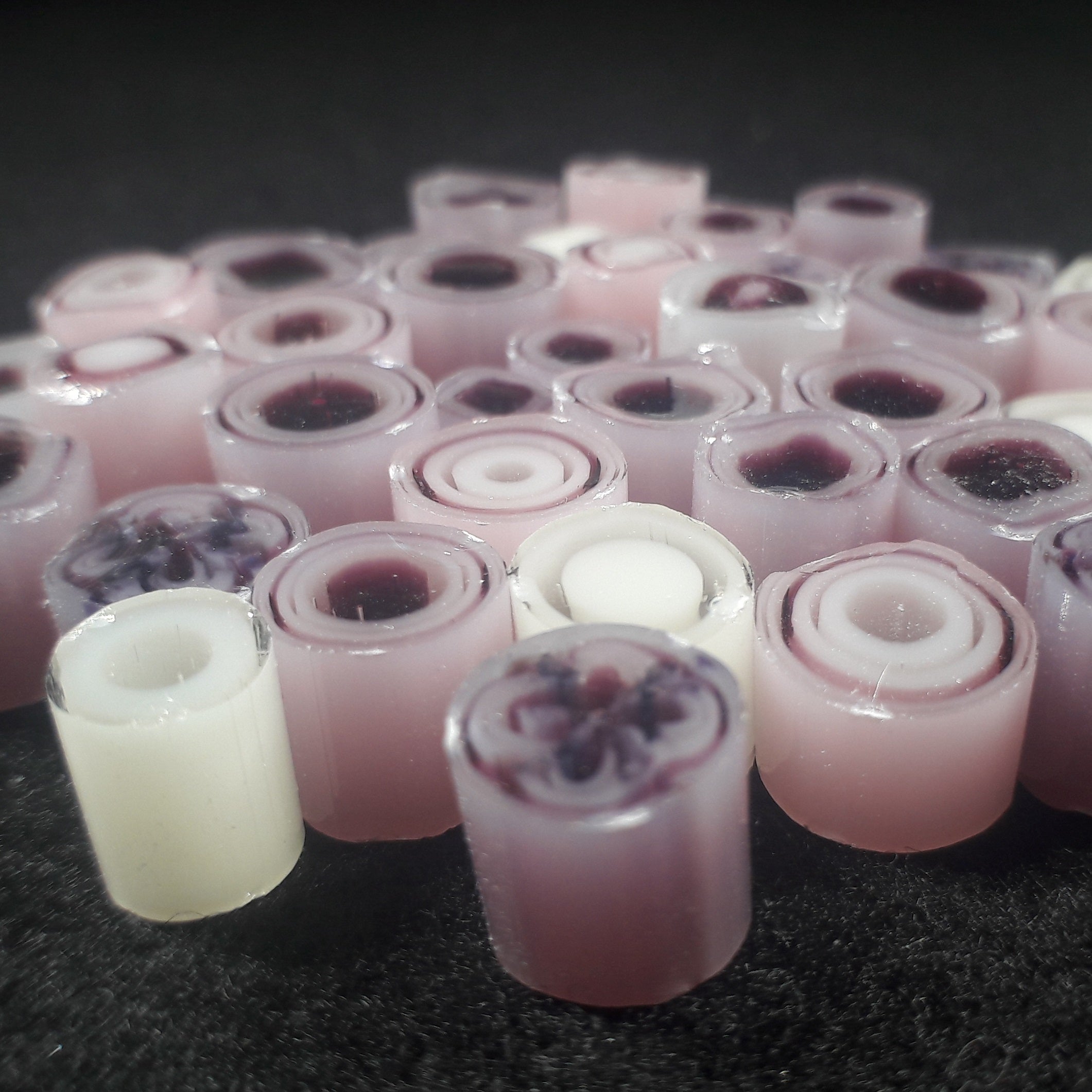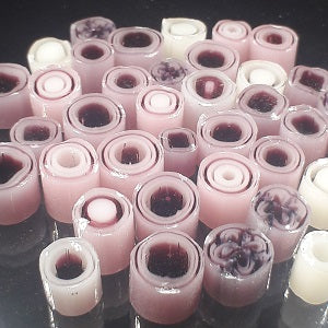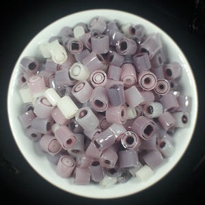 Slices are ≤ 1/8" thick and 1/8" - 6/32" in diameter. Each bag contains 1/4 oz of murrini, which is around 50 slices. You will receive a variety of slices, as pictured in the photos - however, every pull is slightly different so the slices you receive will not be the exact same slices pictured.